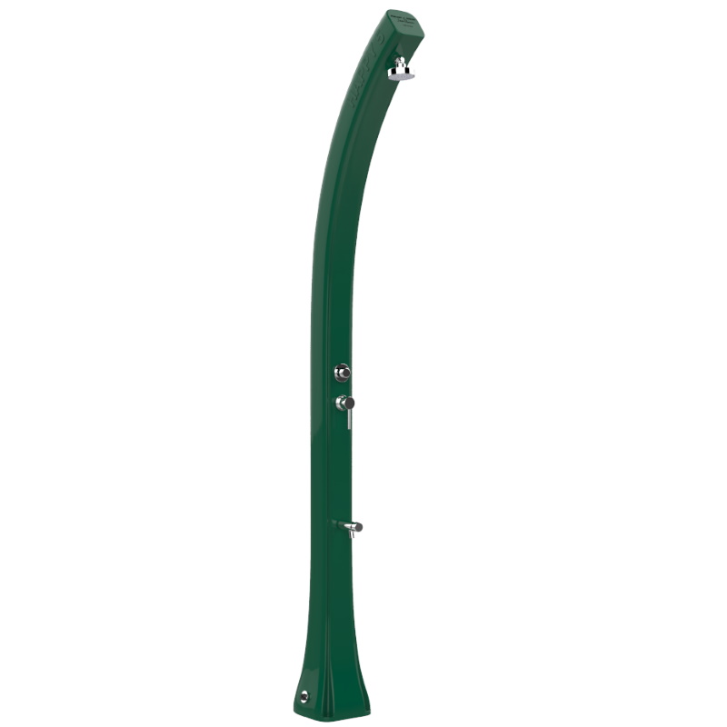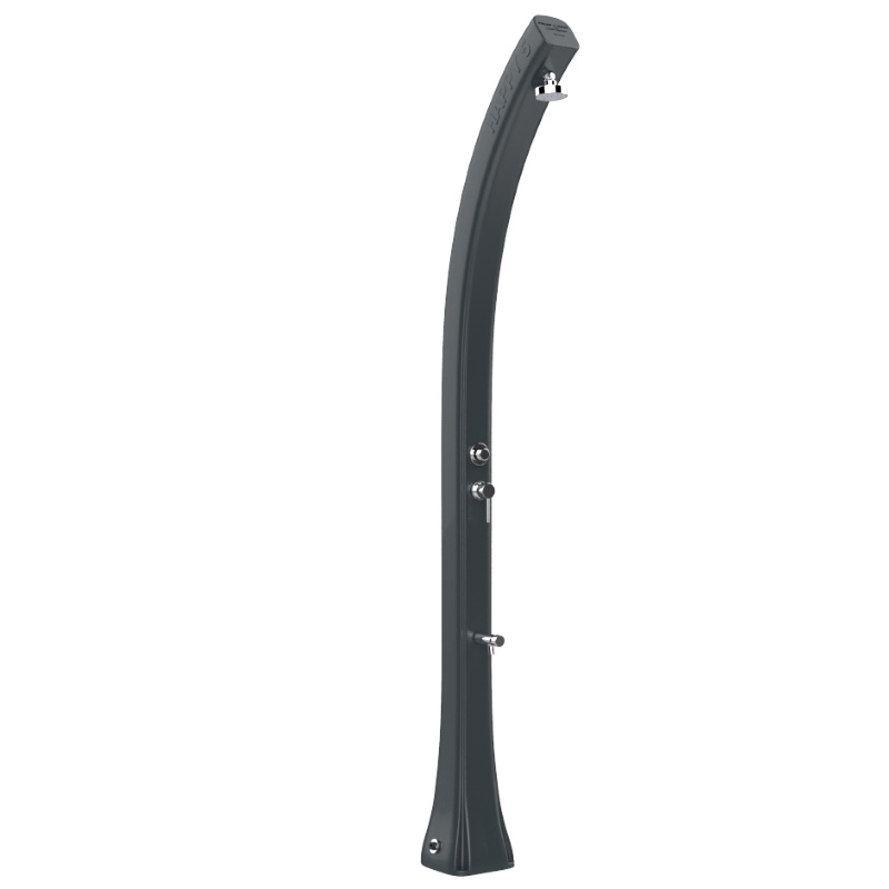 Doccia a riscaldamento solare da esterno, perfetta per un utilizzo pubblico (strutture pubbliche, balneari) o privato (giardini, piscine), grazie ai sistemi di fissaggio da giardino e sabbia di cui è dotata; dispone inoltre di rubinetto lavapiedi, pulsante temporizzato (utile per evitare gli sprechi, in quanto permette di aprire l’acqua con un semplice tocco e la chiusura della stessa è automatica), miscelatore per l’acqua calda e fredda (in particolare il circuito dell’acqua fredda è collegato direttamente all’impianto idrico, mentre il circuito dell’acqua calda è collegato al serbatoio interno della doccia), di un soffione con ampio getto d’acqua e con posizione regolabile, di un tappo di scarico integrato, di una base con attacco ad innesto laterale e valvola di sovrappressione. Questa doccia, caratteristica per il suo design minimalista, è realizzata in polietilene con trattamento anti-corrosione e grazie al serbatoio interno di 24 litri, dove l’acqua viene riscaldata direttamente dal sole, funziona utilizzando esclusivamente fonti di energia rinnovabili, come appunto l’energia derivata dalla luce solare.