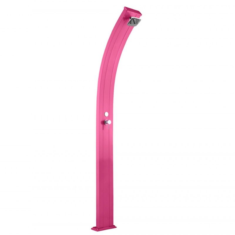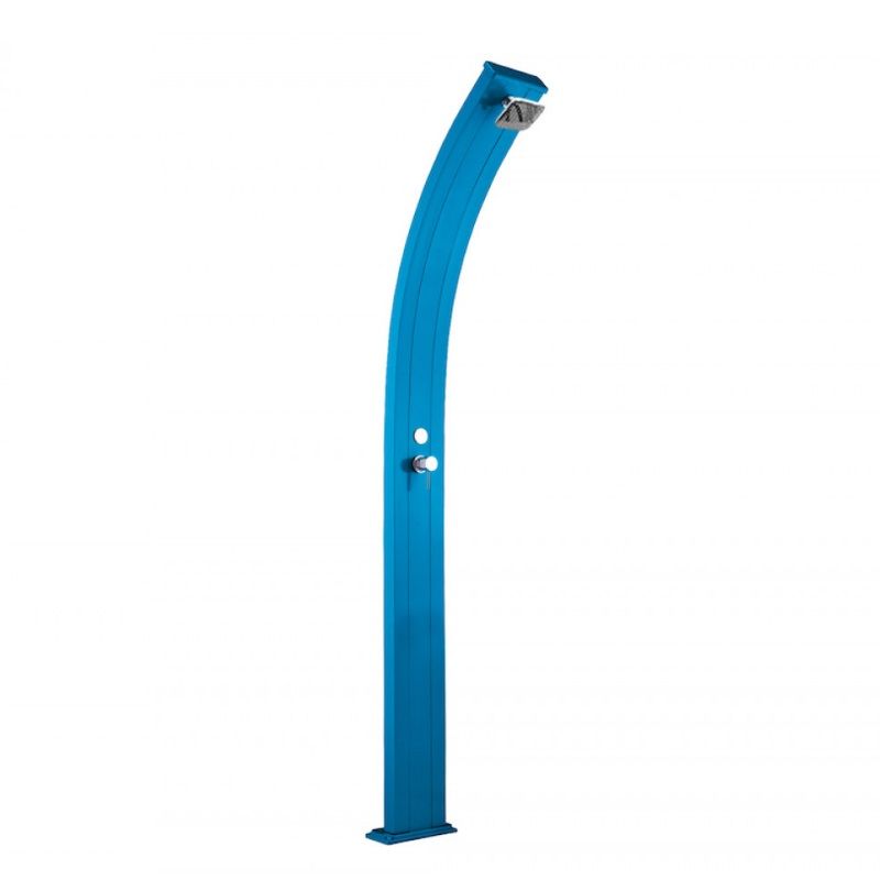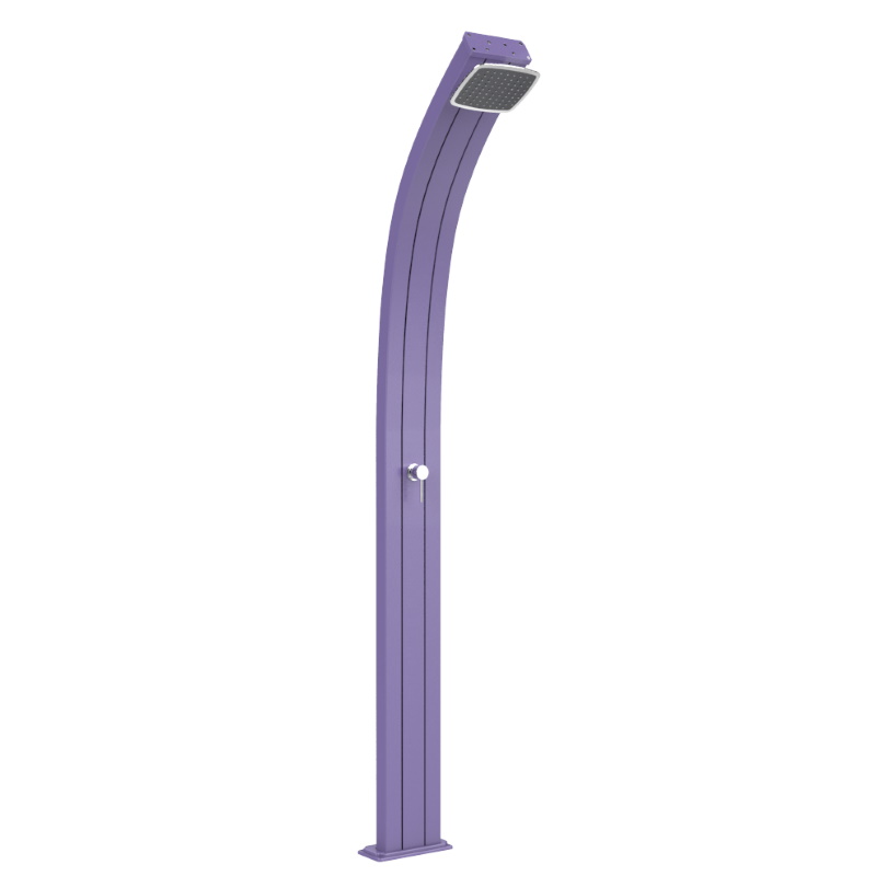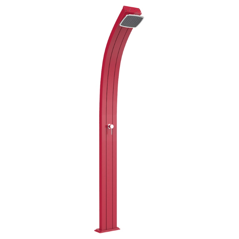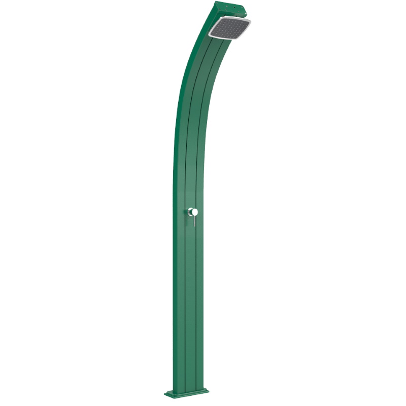 Doccia a riscaldamento solare da esterno, perfetta per un utilizzo pubblico (strutture pubbliche, balneari) o privato (giardini, piscine), grazie ai sistemi di fissaggio da giardino e sabbia di cui è dotata; dispone inoltre di miscelatore per l’acqua calda e fredda (in particolare il circuito dell’acqua fredda è collegato direttamente all’impianto idrico, mentre il circuito dell’acqua calda è collegato al serbatoio interno della doccia), di un soffione con ampio getto d’acqua e con posizione regolabile, di un tappo di scarico integrato, di una base con attacco ad innesto laterale e valvola di sovrappressione. Questa doccia, caratteristica per il suo design minimalista, è realizzata in alluminio con trattamento anti-corrosione e grazie al serbatoio interno di 25 litri, dove l’acqua viene riscaldata direttamente dal sole, funziona utilizzando esclusivamente fonti di energia rinnovabili, come appunto l’energia derivata dalla luce solare.