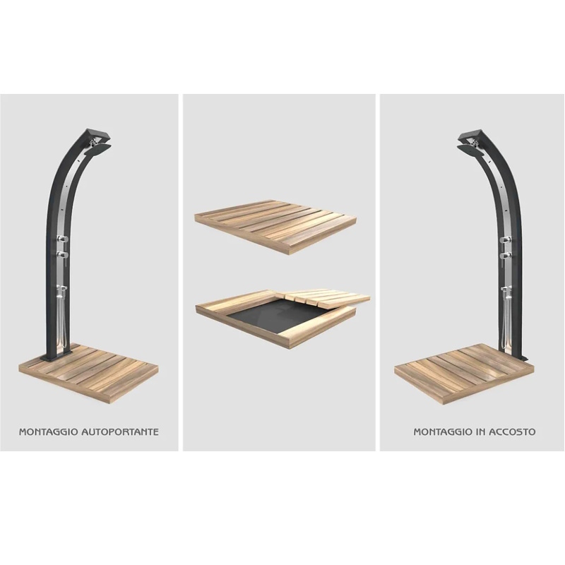 Piatto doccia da esterno, abbinabile a tutte le doccie della gamma Arkema, realizzato in legno di Okumè (un tipo di legno molto resistente e che migliora con il tempo). Questo piatto può essere montato in accosto o in modo autoportante (collocando la doccia sulla parte con doghe fisse) ed è facile da installare, in quanto non occorrono particolari competenze nè fori a pavimento o modifiche strutturali di alcun tipo.